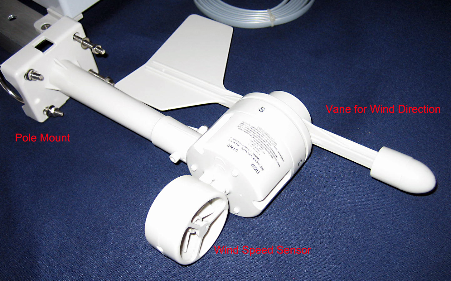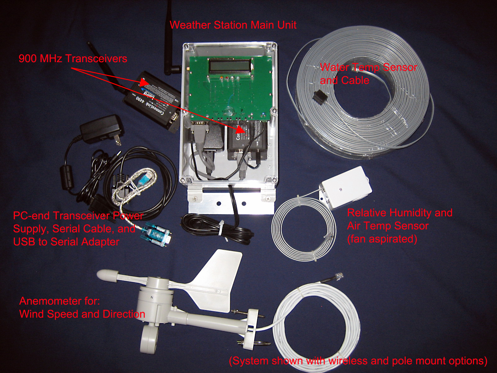 The weather station hardware consists of a main unit, a humidity and air temp unit, an anemometer, and a water temp sensor.